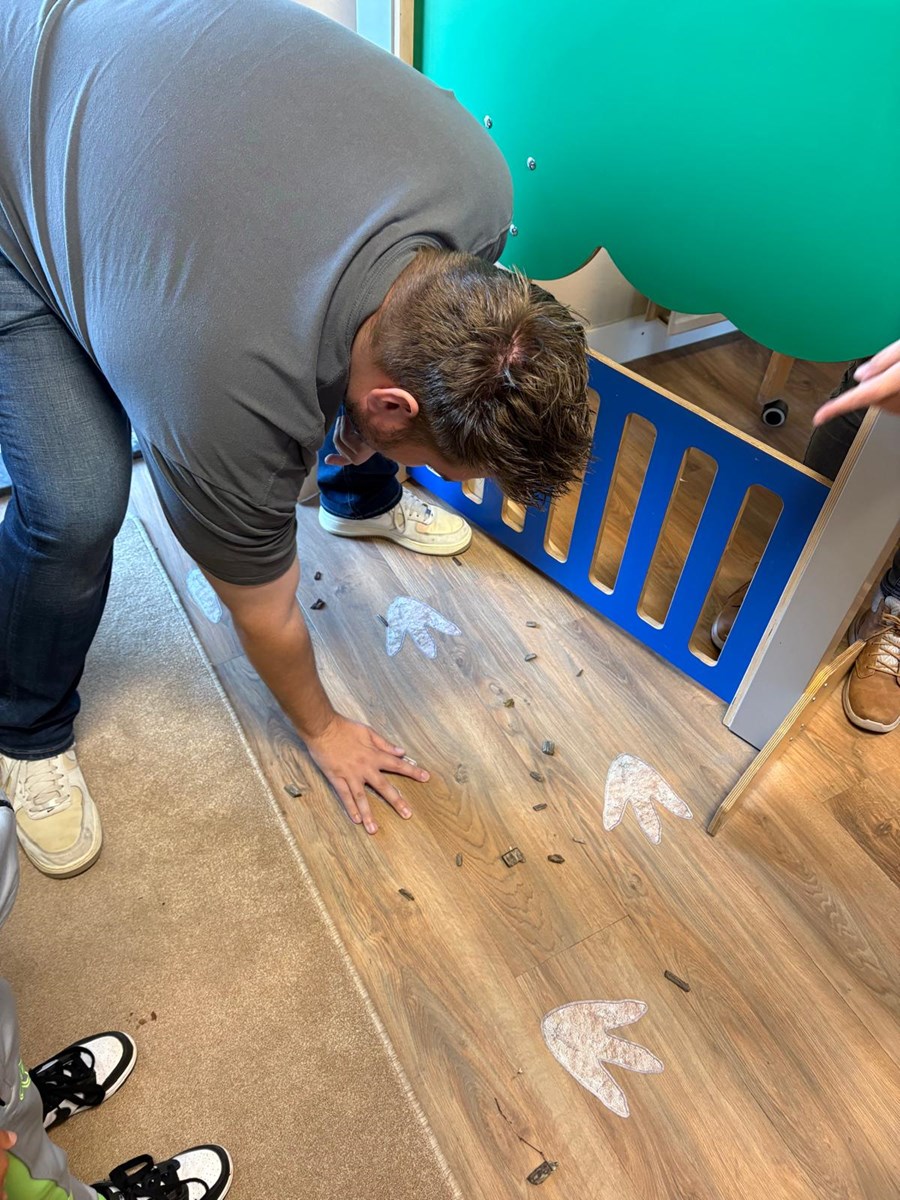 Vanmorgen vroeg was er wel iets heel raars gebeurd. In de klas waren pootafdrukken te zien, er lagen stoelen om en er lag allemaal zand, takjes en steentjes in de klas. Wie is hier binnen geweest?? Was dit een grote dino of een kleine? Daniel zijn hand was te klein, dus de dino is groter dan Daniel. Meester Yoram heeft wel de grootste handen van de school, dus die heeft Haroun even opgehaald. Maaaaar... De dinopoot was kleiner. Conclusie: hij is kleiner dan meester Yoram, maar groter dan de kinderen.