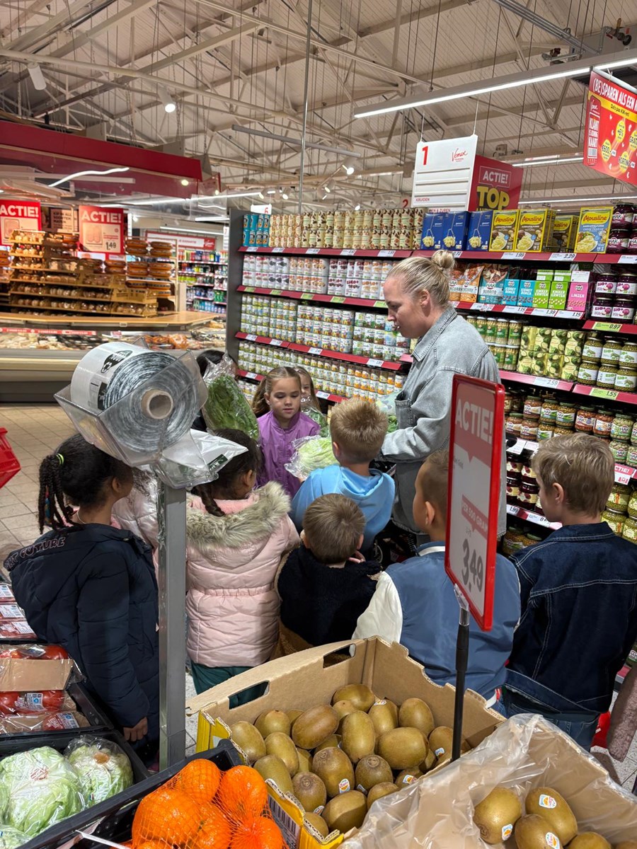 Hoe komen we daar nu toch achter? Het idee kwam om 2 bordjes neer te zetten met eten. Eén gevuld met blaadjes en de ander met vlees. We hebben in de koelkast gekeken, maar geen vlees. Waar kunnen we dit halen? Bij de VOMAR! We zijn dus met zijn allen naar de Vomar gelopen om sla en vlees te halen. We hebben prijzen bekeken, want juf had een briefje van 10 euro mee en wat muntjes. Het mooie stuk vlees van €36,75 was dus een beetje te duur. Op zoek naar iets anders.