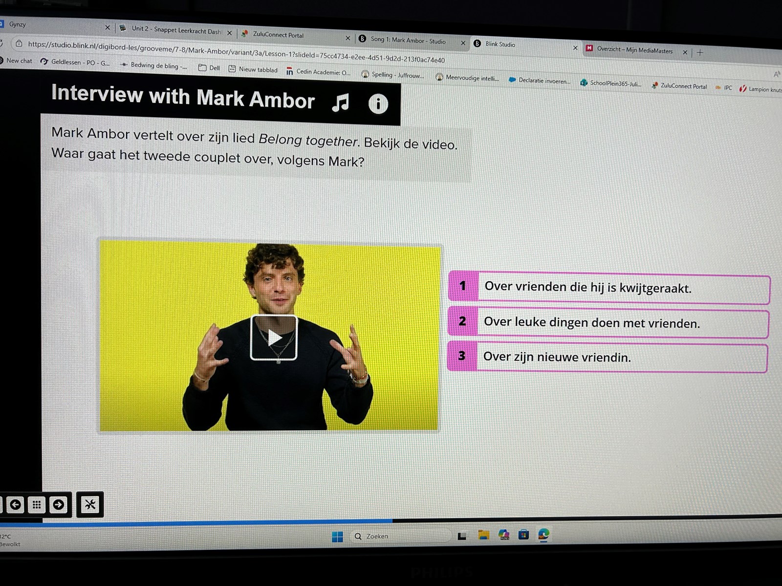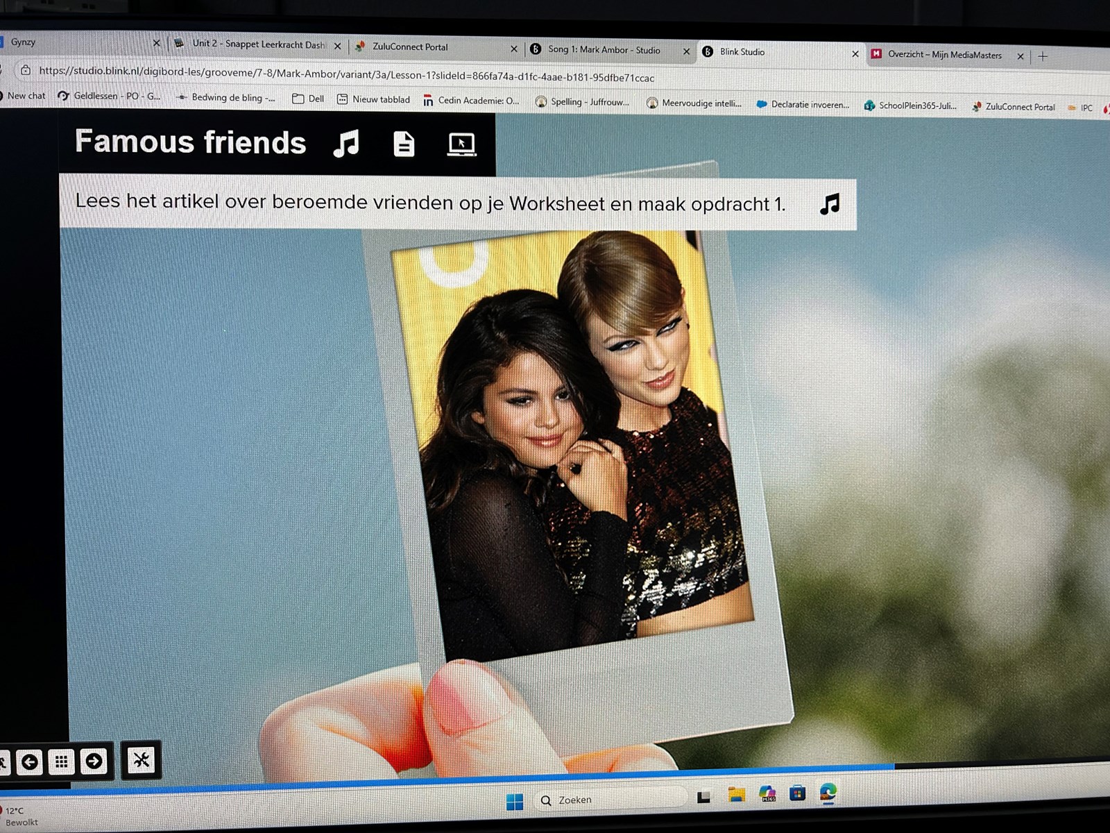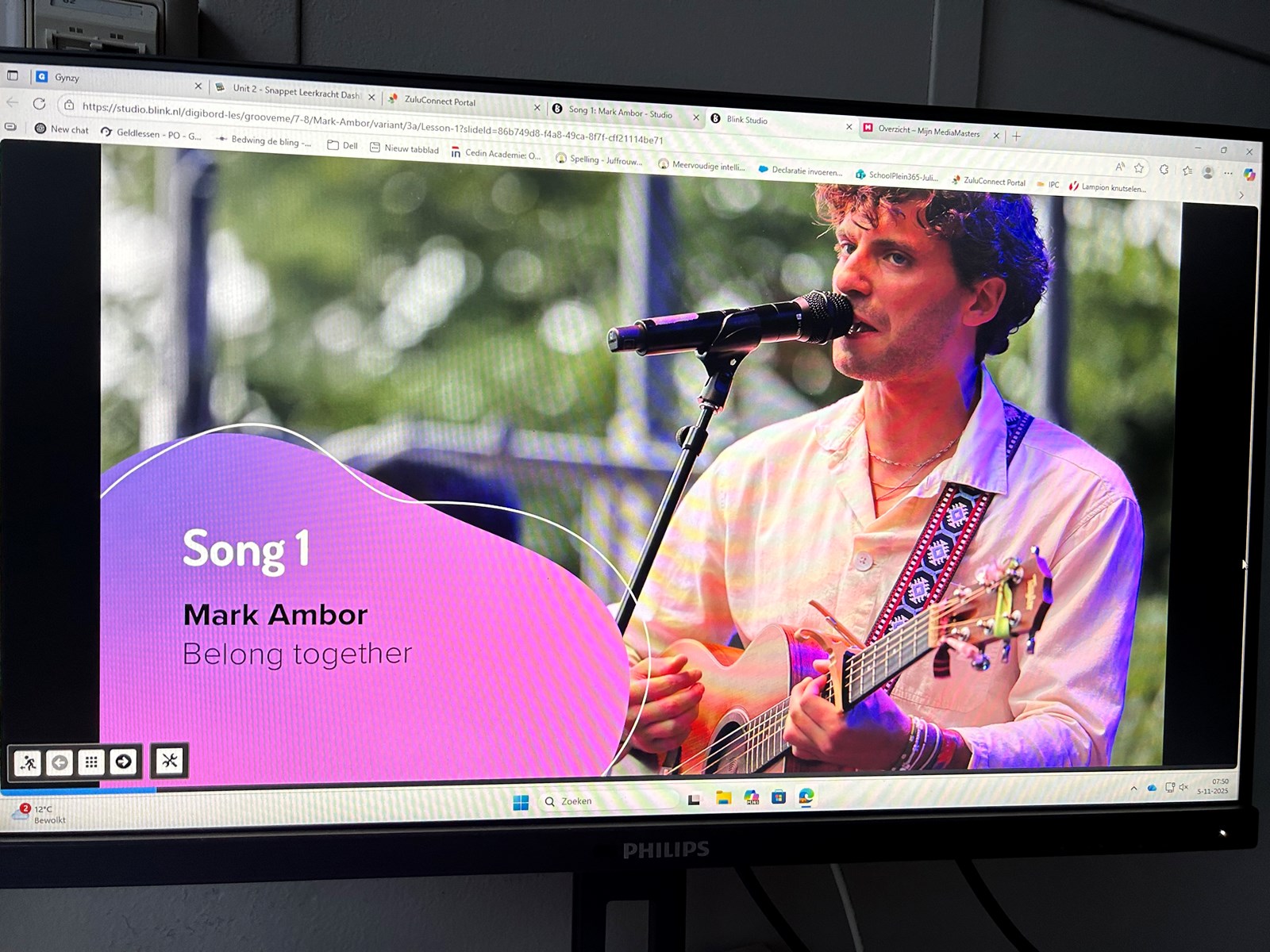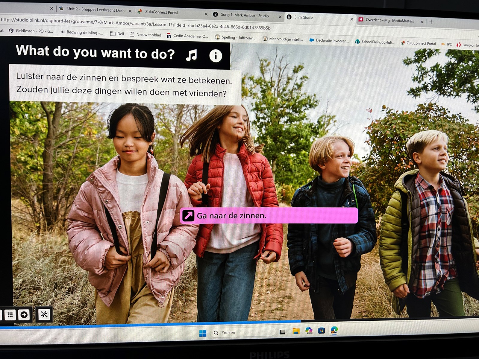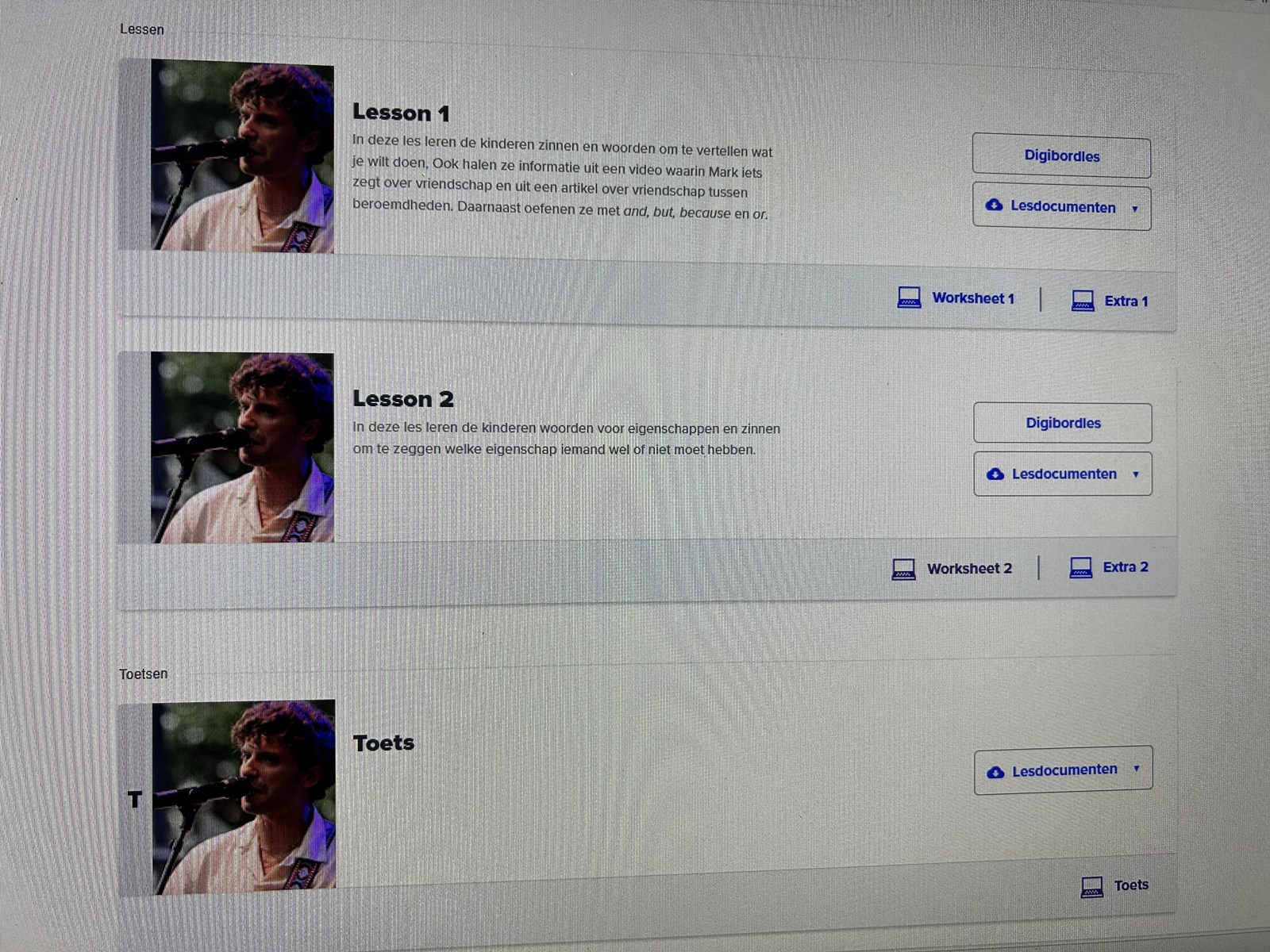 Groep 5-6 en 7-8 krijgen op eigen niveau les. De opbouw van de les is afwisselend: werken met de songtekst, zinnen uitspreken, luisteren in het Engels. Een song heeft twee lessen. Daarna sluiten we de les af met een toets. Elke 3 weken is er een nieuwe song.