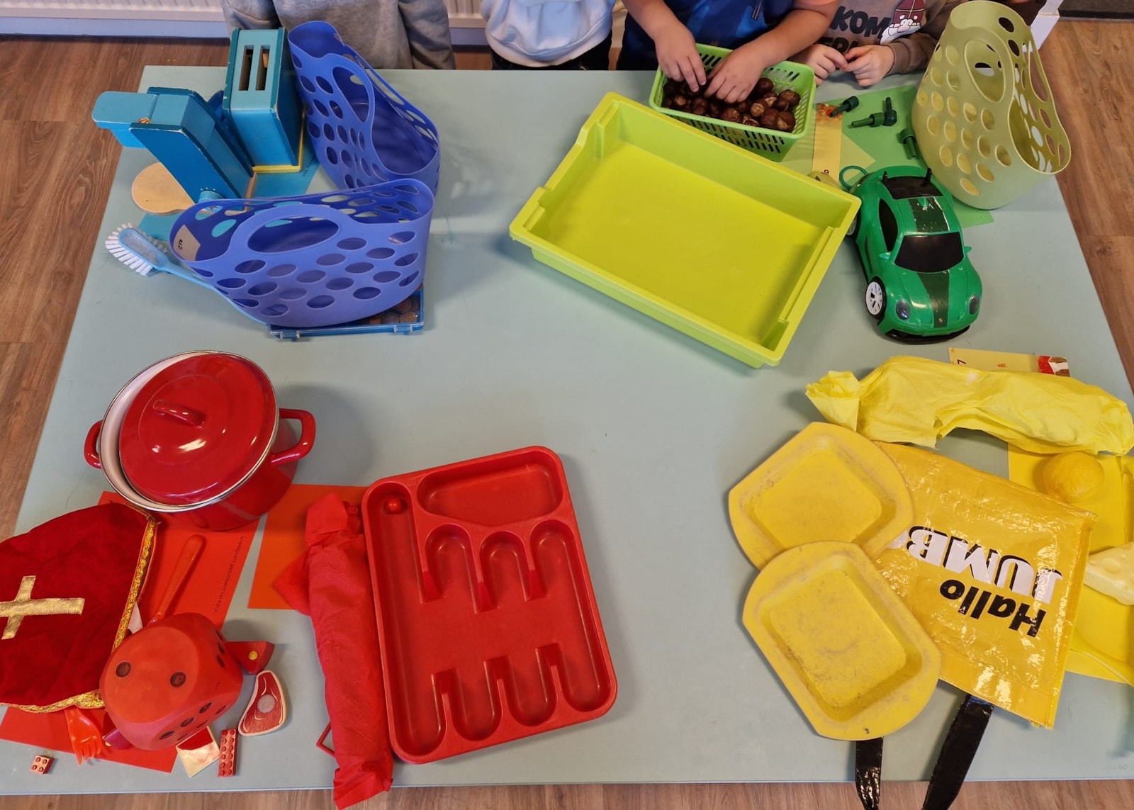 Binnen het IPC-thema Feest gingen de jongste kinderen aan de slag met het sorteren van speelgoed. Ze bekeken verschillende soorten speelgoed en leerden dit te ordenen op kleur en materiaal, zoals hout, plastic en stof. Door goed te kijken, te voelen en te vergelijken ontdekten de kinderen dat speelgoed op verschillende manieren bij elkaar kan horen.