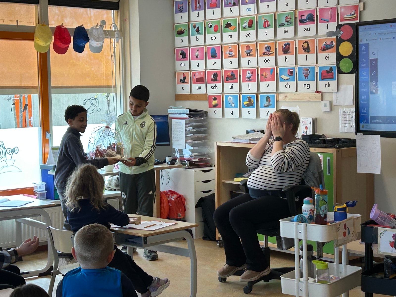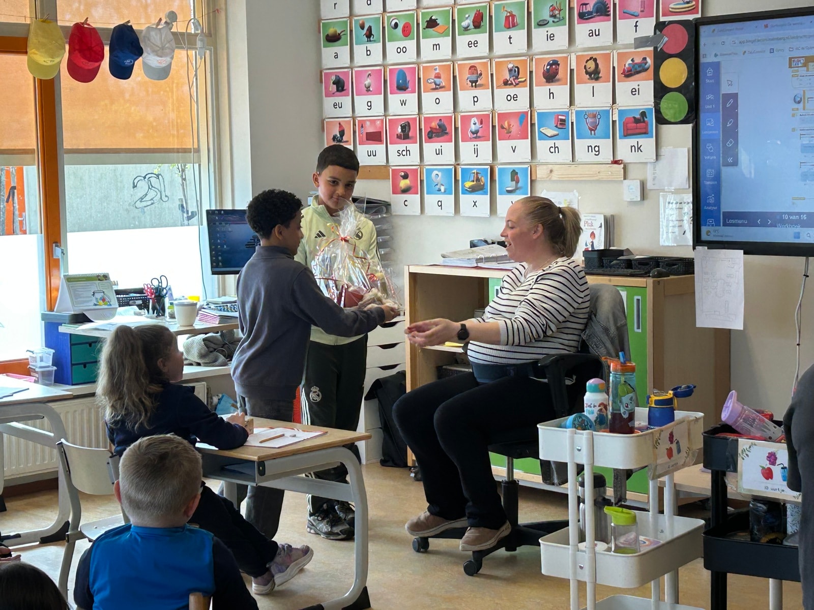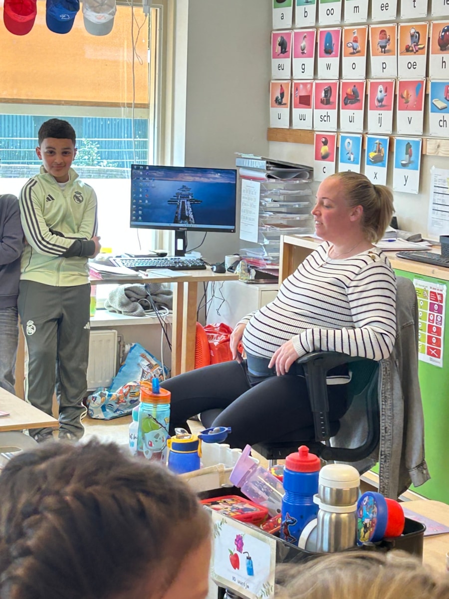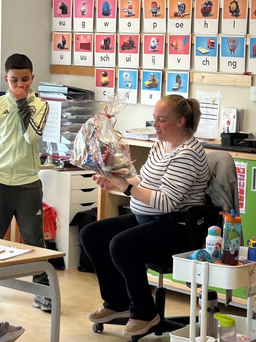 Vandaag is de laatste dag dat juf Janice op school aan het werk is voordat haar verlof in gaat. Er is vanuit de leerlingen een leuk pakket gegeven waar juf Janice heel blij van werd.