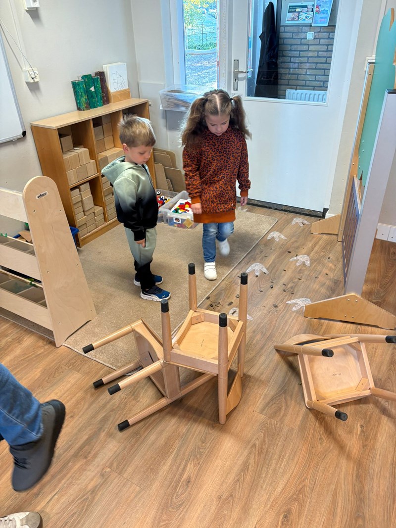 Vanmorgen vroeg was er wel iets heel raars gebeurd. In de klas waren pootafdrukken te zien, er lagen stoelen om en er lag allemaal zand, takjes en steentjes in de klas. Wie is hier binnen geweest?? Was dit een grote dino of een kleine? Daniel zijn hand was te klein, dus de dino is groter dan…